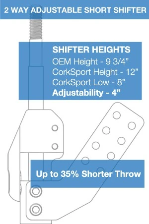 Shifter Height The CorkSport engineers created a simple way for you to adjust the shift knob height a range of 4 inches. With a height of 12" and a low of 8"
